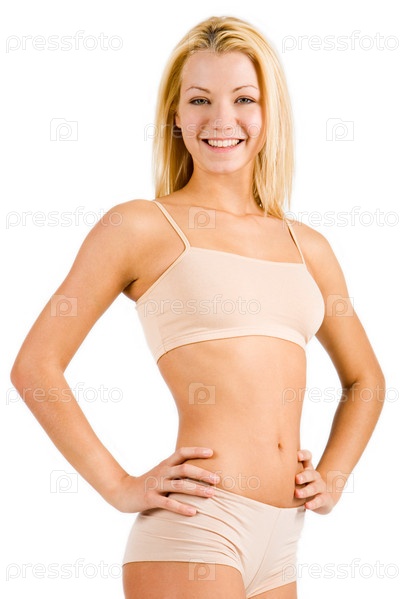 Портрет здоровой женщины в нижнем белье, держа руки на поясе и улыбающейся камере