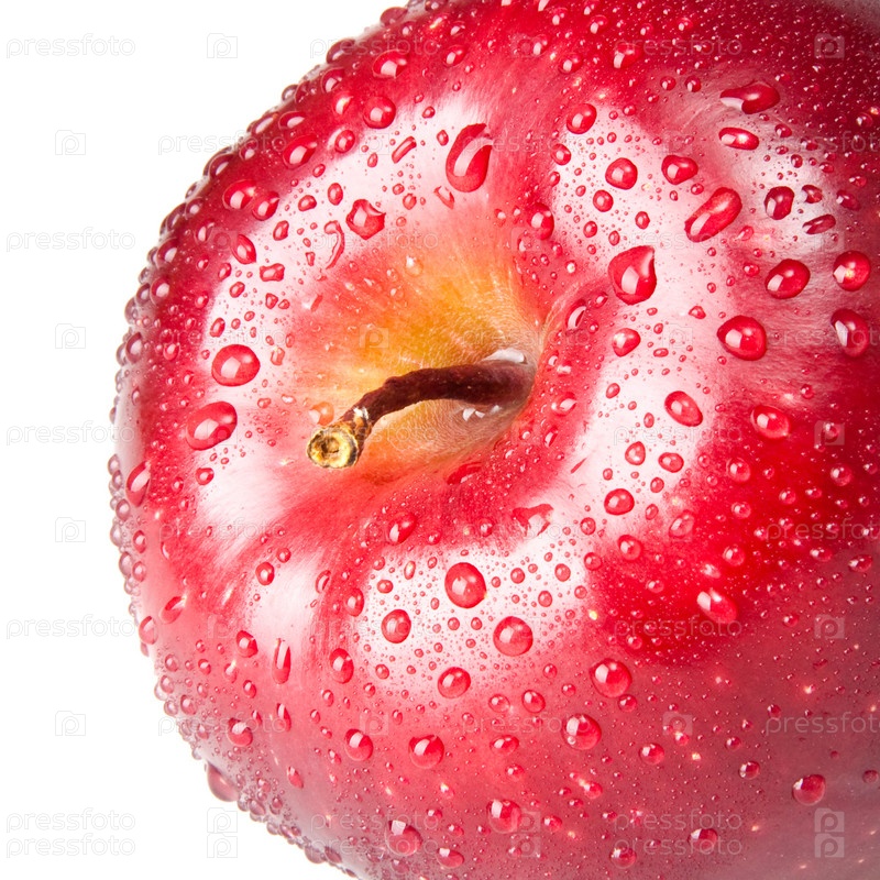 Красное яблоко в капельках воды на белом фоне