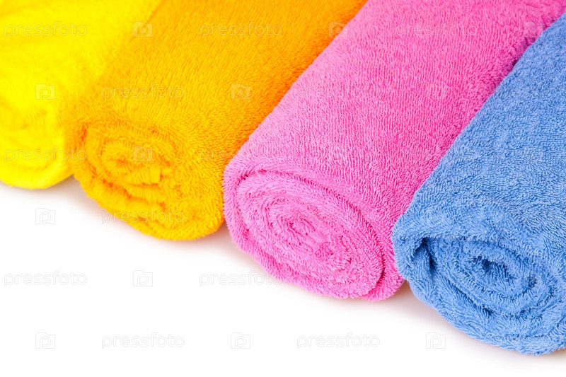 Четыре свернутых рулоном цветных полотенца на белом фоне