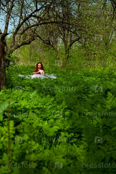 Девушка в белом платье сидит на зеленой траве в лесу