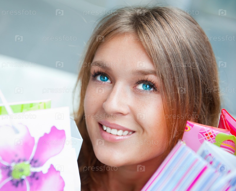 Мечтательная девушка с покупками крупным планом