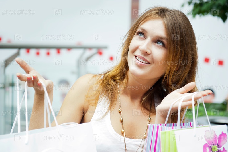Счастливая девушка с покупками в торговом центре