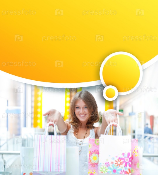 Счастливая девушка с покупками в разноцветных пакетах с местом для текста