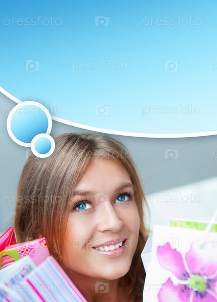 Счастливая девушка с покупками в разноцветных пакетах с местом для текста