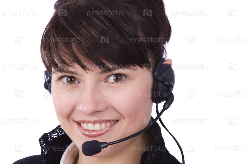 Helpdesk или оператор службы поддержки. Успешный бизнесмен говорит через гарнитуру с микрофоном. Как я могу вам помочь? Лицо молодой очаровательной уверенной в себе женщины с гарнитурой. Изолированное на белом фоне