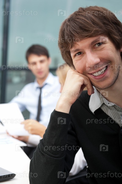 Задумчивый бизнесмен с работающими коллегами на заднем плане