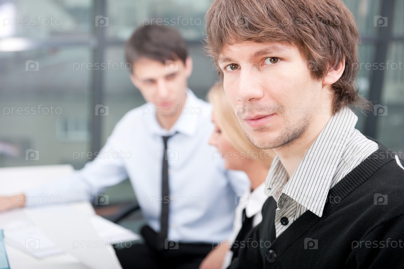 Задумчивый бизнесмен с работающими коллегами на заднем плане