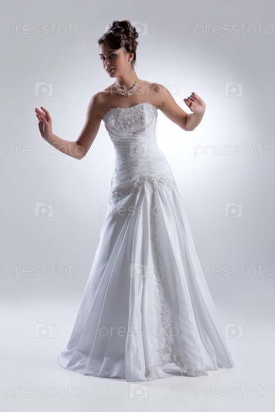 Невеста в свадебном платье на сером фоне