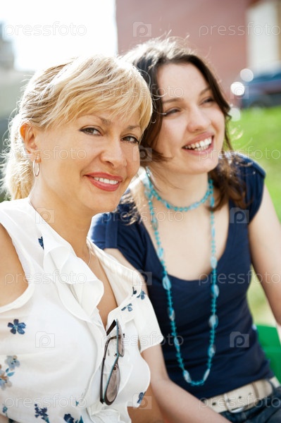 Портрет двух улыбающихся женщин в парке