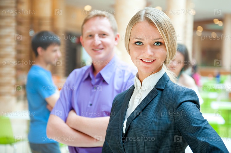 Портрет улыбающейся бизнес-леди с коллегами на заднем плане