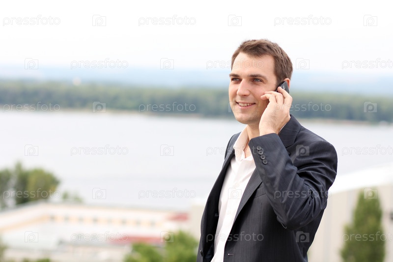 Молодой бизнесмен разговаривает по мобильному телефону на улице