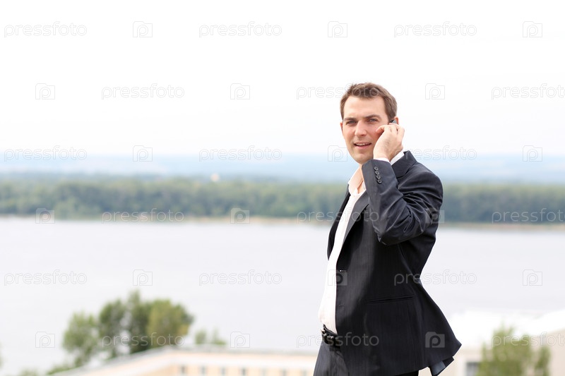 Молодой бизнесмен разговаривает по мобильному телефону на улице