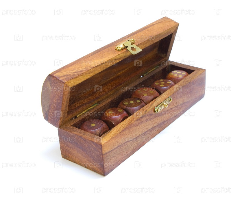 Набор игральных костей в деревянном футляре на белом фоне