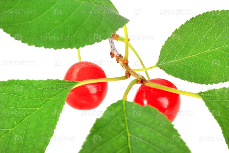 Одна ветка с зелеными листьями и двумя красными вишнями на белом фоне. Крупным планом. Студийная съемка