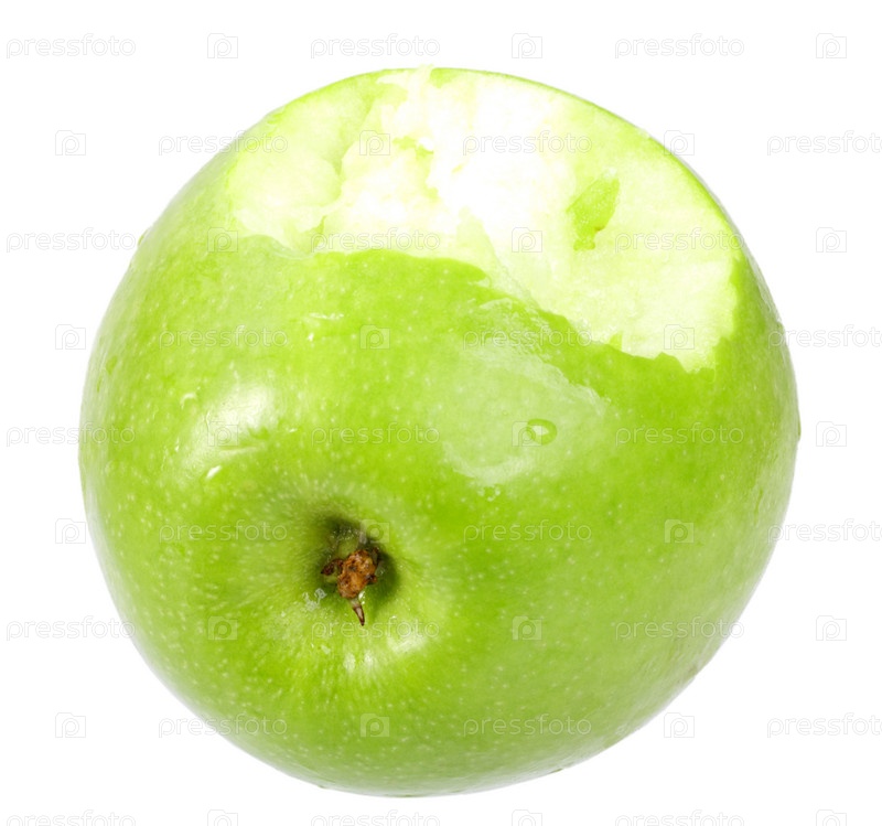 Одно надкусанное зеленое яблоко. Изолированное на белом фоне. Крупным планом. Студийная съемка