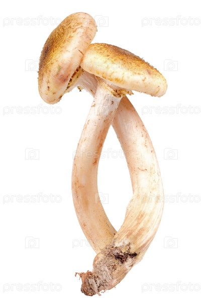 Два переплетающихся свежих гриба с коричневыми шляпками на белых ножках. Крупным планом. Изолированные на белом фоне. Студийная съемка