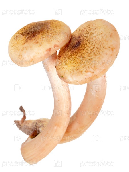 Два переплетающихся свежих гриба с коричневыми шляпками на белых ножках. Крупным планом. Изолированные на белом фоне. Студийная съемка