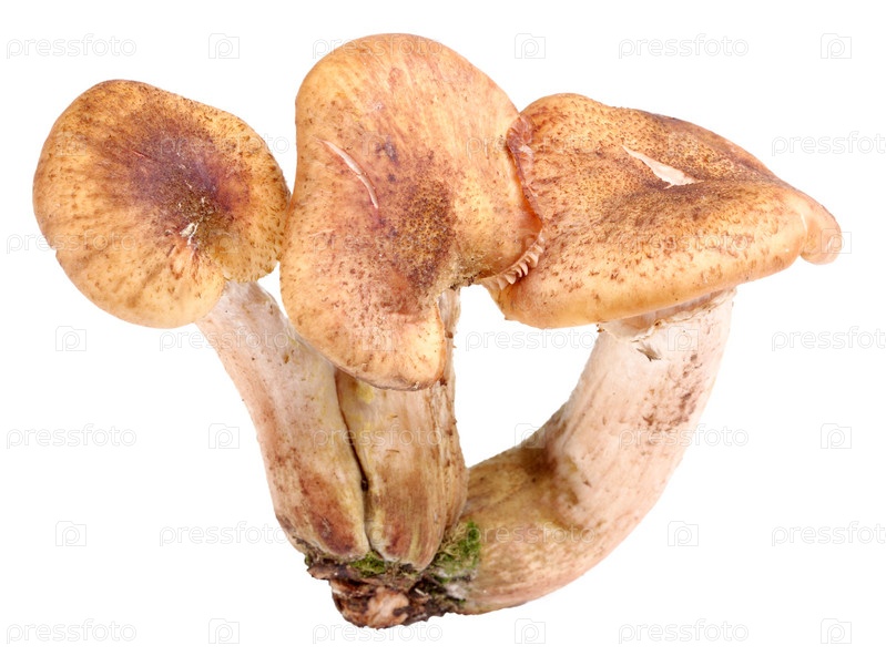 Группа из трех свежих сросшихся грибов с коричневыми шляпками. Крупным планом. Изолированные на белом фоне. Студийная съемка
