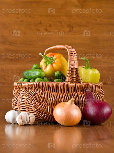 Свежие овощи в корзине на деревянном фоне