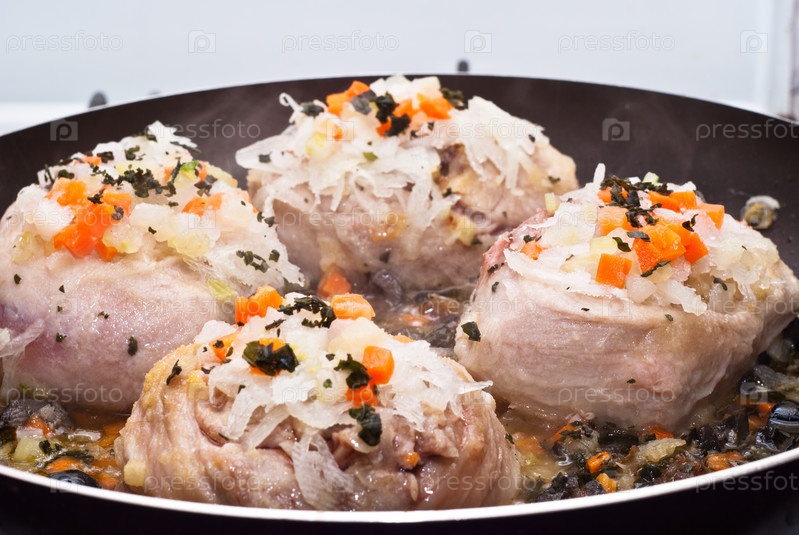 Телячья голень готовится в сковороде