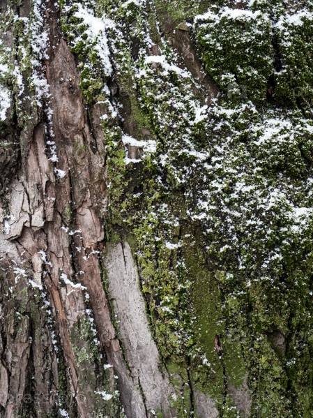 Бесшовная кора, поросшая мхом, в снегу