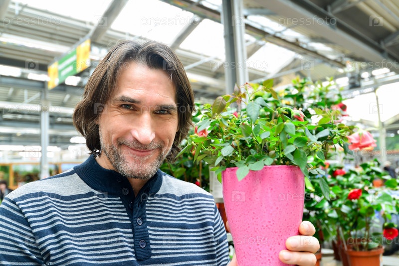 Мужчина держит цветок, работая в теплице