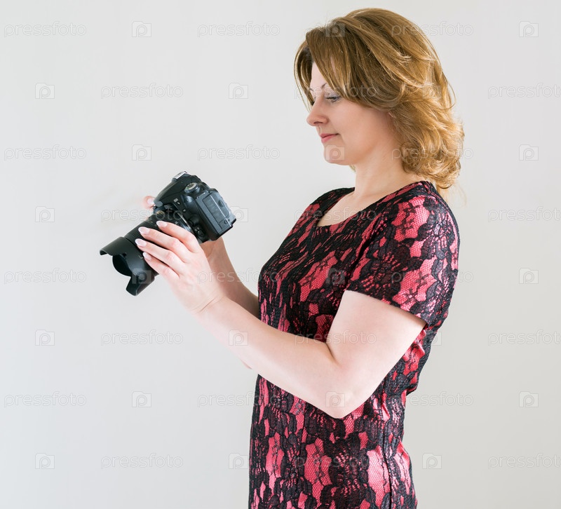 Женщина с фотоаппаратом на светлом фоне