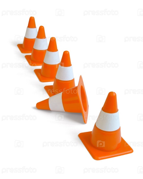 Ряд дорожных конусов на белом фоне