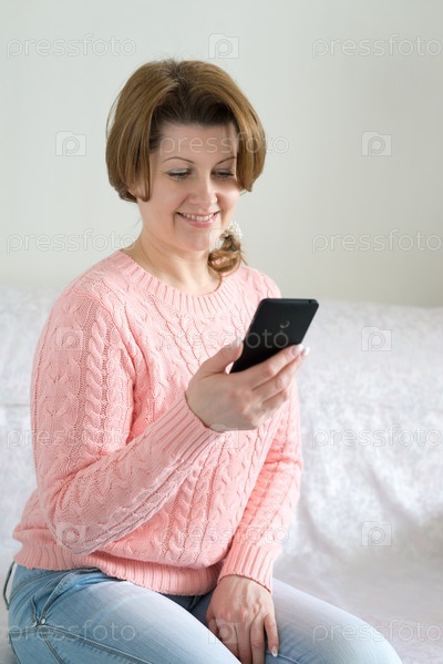 Позитивная женщина с мобильным телефоном в руке