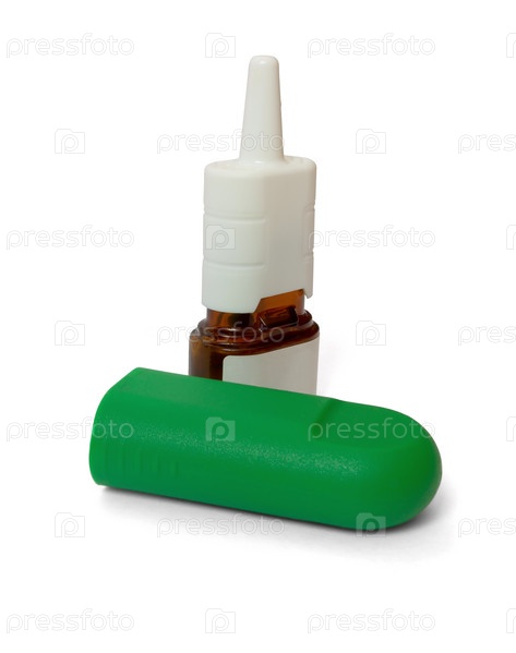 Флакон с каплями для носа на белом фоне