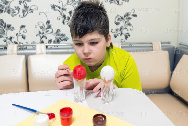 Мальчик красит пасхальные яйца