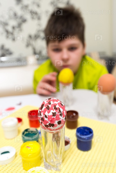 Мальчик красит пасхальные яйца
