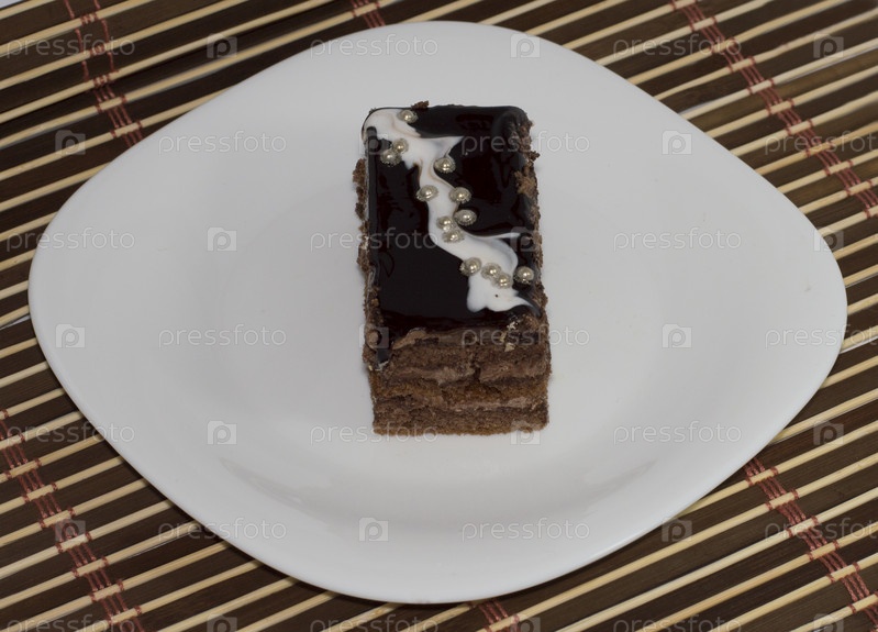Коричневый торт с жемчугом на тарелке