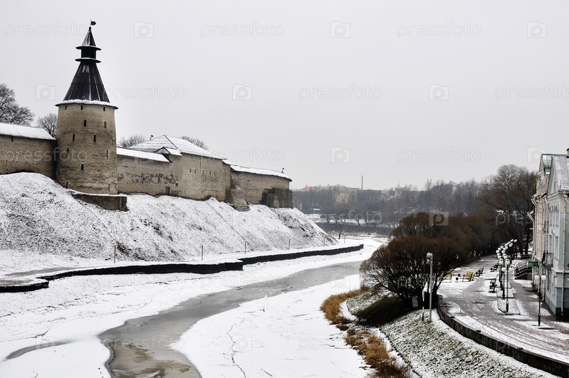 Вид с реки на Псковский Кремль (Кром) зимой