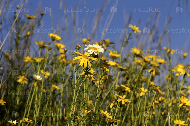 Коронованная хризантема (Chrysanthémum coronárium) на фоне голубого неба
