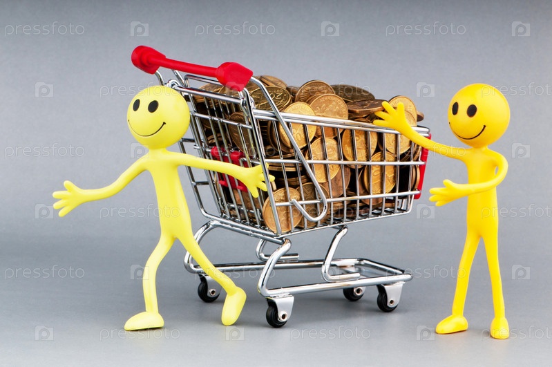 Счастливая семья с продуктовой тележкой, наполненной монетами
