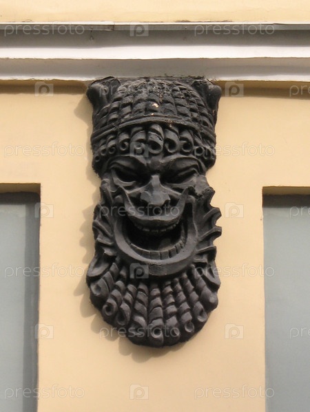 Стилизованная театральная маска-светильник на фасаде Малого драматического театра (МДТ) "Театра Европы". Санкт-Петербург