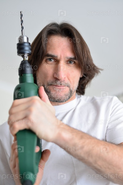 Мужчина средних лет с дрелью в руках