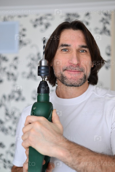 Мужчина средних лет с дрелью в руках