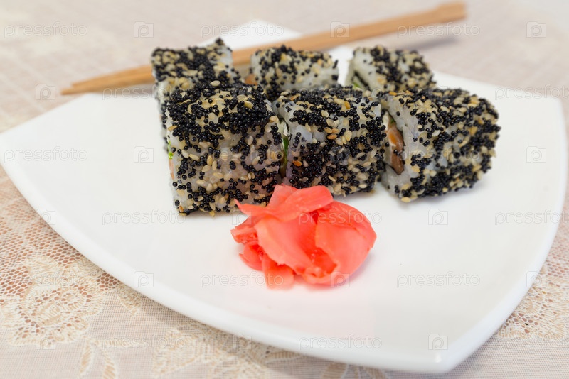 Суши роллы с васаби и имбирем на тарелке