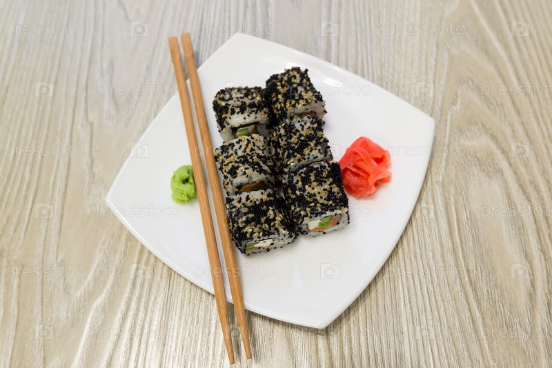 Суши роллы с васаби и имбирем на тарелке
