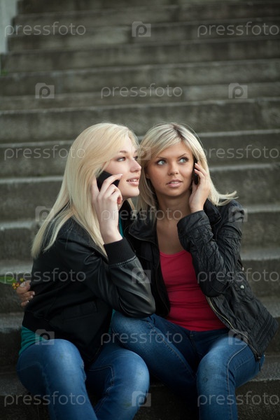 Две молодые женщины сидят на ступенях и разговаривают по телефону