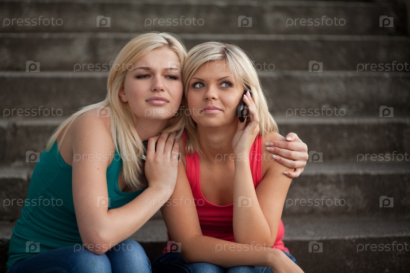 Молодая женщина сидит на ступенях с подругой и разговаривает по телефону