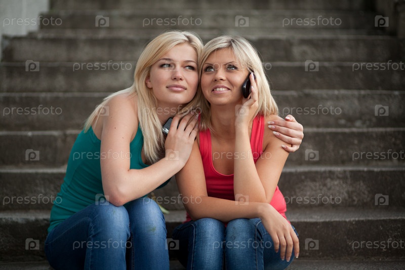 Молодая женщина сидит на ступенях с подругой и разговаривает по телефону