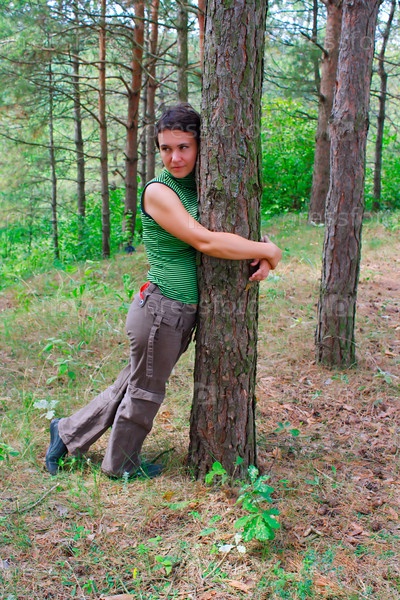 Молодая женщина стоит около сосны