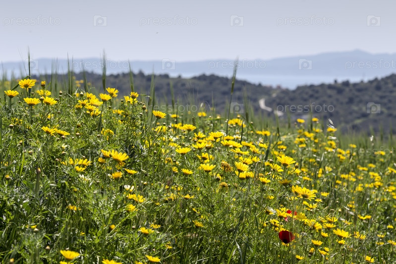 Коронованная хризантема (Chrysanthémum coronárium) на фоне гор и неба