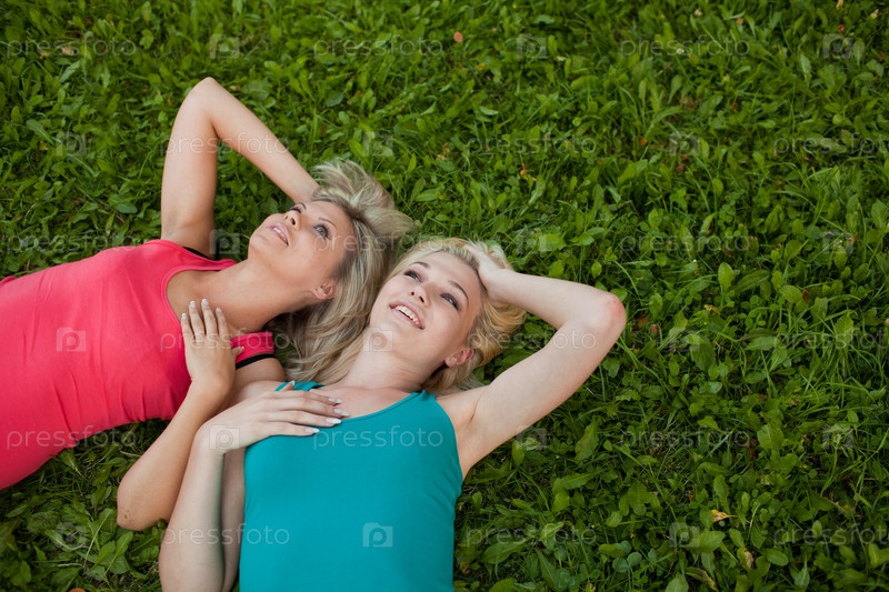 Две молодые женщины лежат на траве