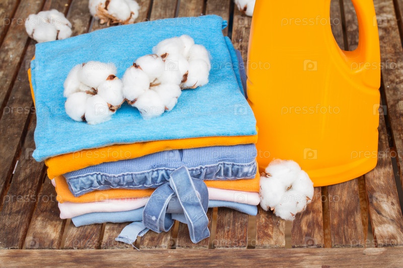 Бутылка моющего средства и одежда
