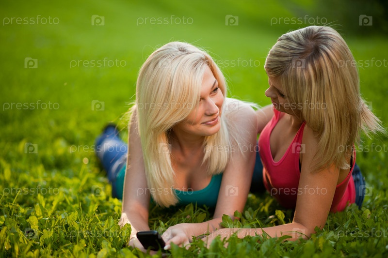 Две молодые женщины с мобильным телефоном лежат на траве