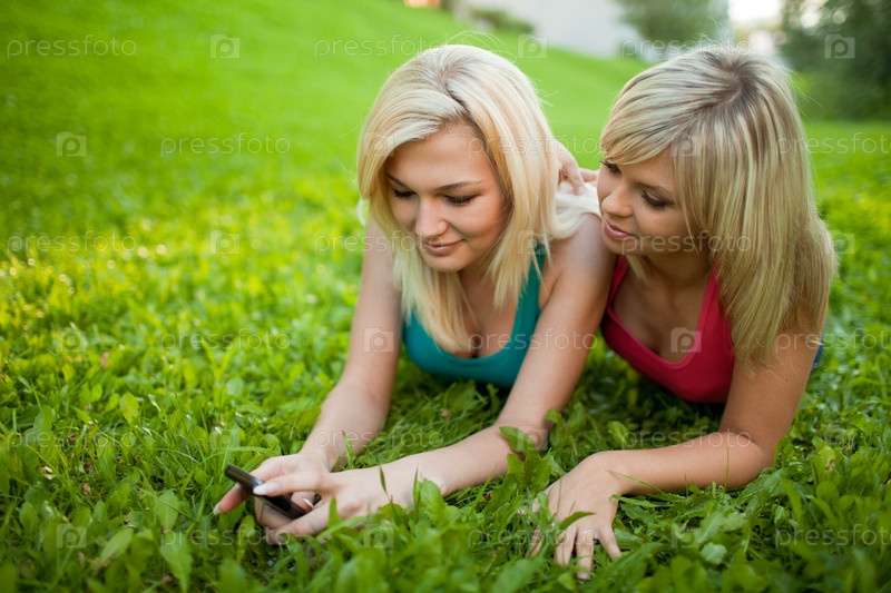 Две молодые женщины с мобильным телефоном лежат на траве